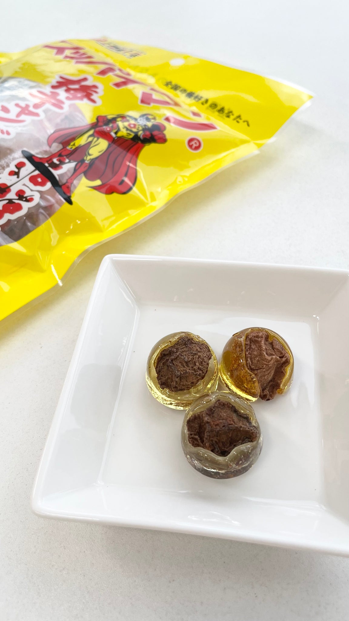 大人気のスッパイマン甘梅一番たねありを甘いべっこう飴で包み込みました。